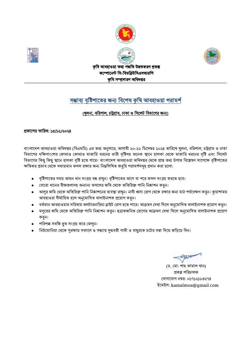 বিশেষ কৃষি আবহাওয়া পরামর্শ ১৫/১২/২০২৪